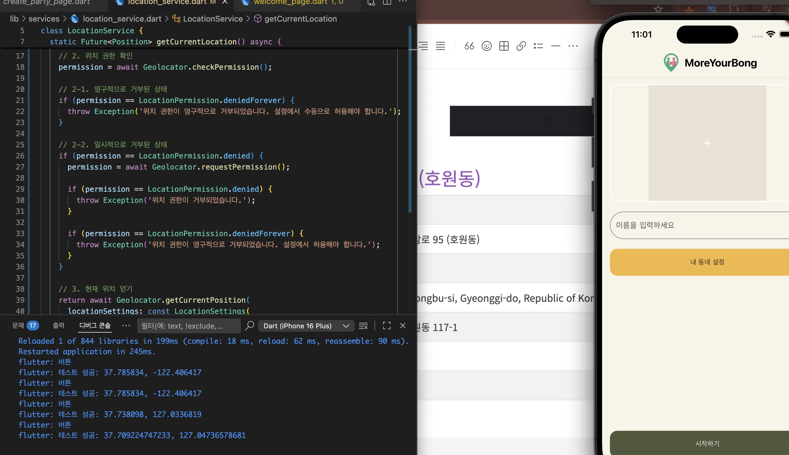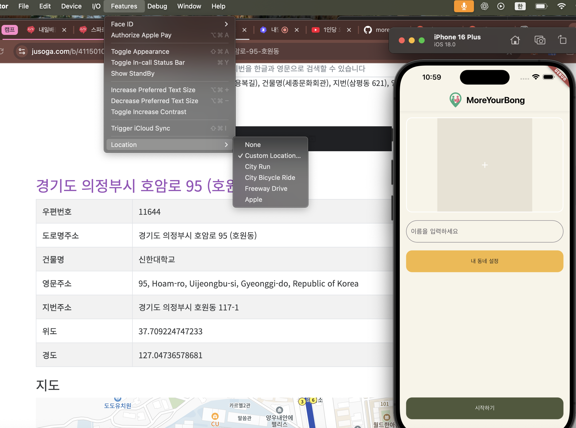Flutter에서 위치 기반 기능을 개발할 때 시뮬레이터에서도 충분히 테스트할 수 있다. 실제 기기를 연결하지 않아도, 시뮬레이터 설정만으로도 원하는 좌표를 적용해 기능 구현 및 디버깅이 가능하다.